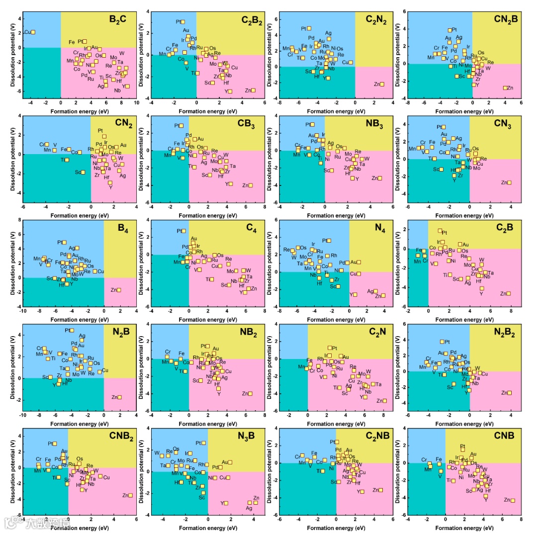 图2. 20种-BxCyNz配位环境下20个不同过渡金属单原子的稳定性、金属形成能和电化学溶解势关系。其中,形成能越负,溶解电位越正,表明体系稳定性越好。