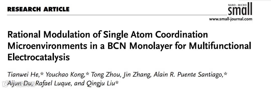 “Rational Modulation of Single Atom Coordination Microenvironments in a BCN Monolayer for Multifunctional Electrocatalysis”. Tianwei He,* Youchao Kong,* Tong Zhou, Jin Zhang, Alain R. Puente Santiago,*Aijun Du, Rafael Luque, and Qingju Liu*. Small 2023, 23024.