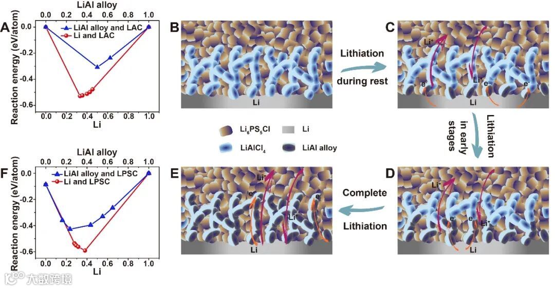 图1. 金属锂与牺牲层中卤化物与硫化物的反应能,以及牺牲层锂化过程演变示意图。