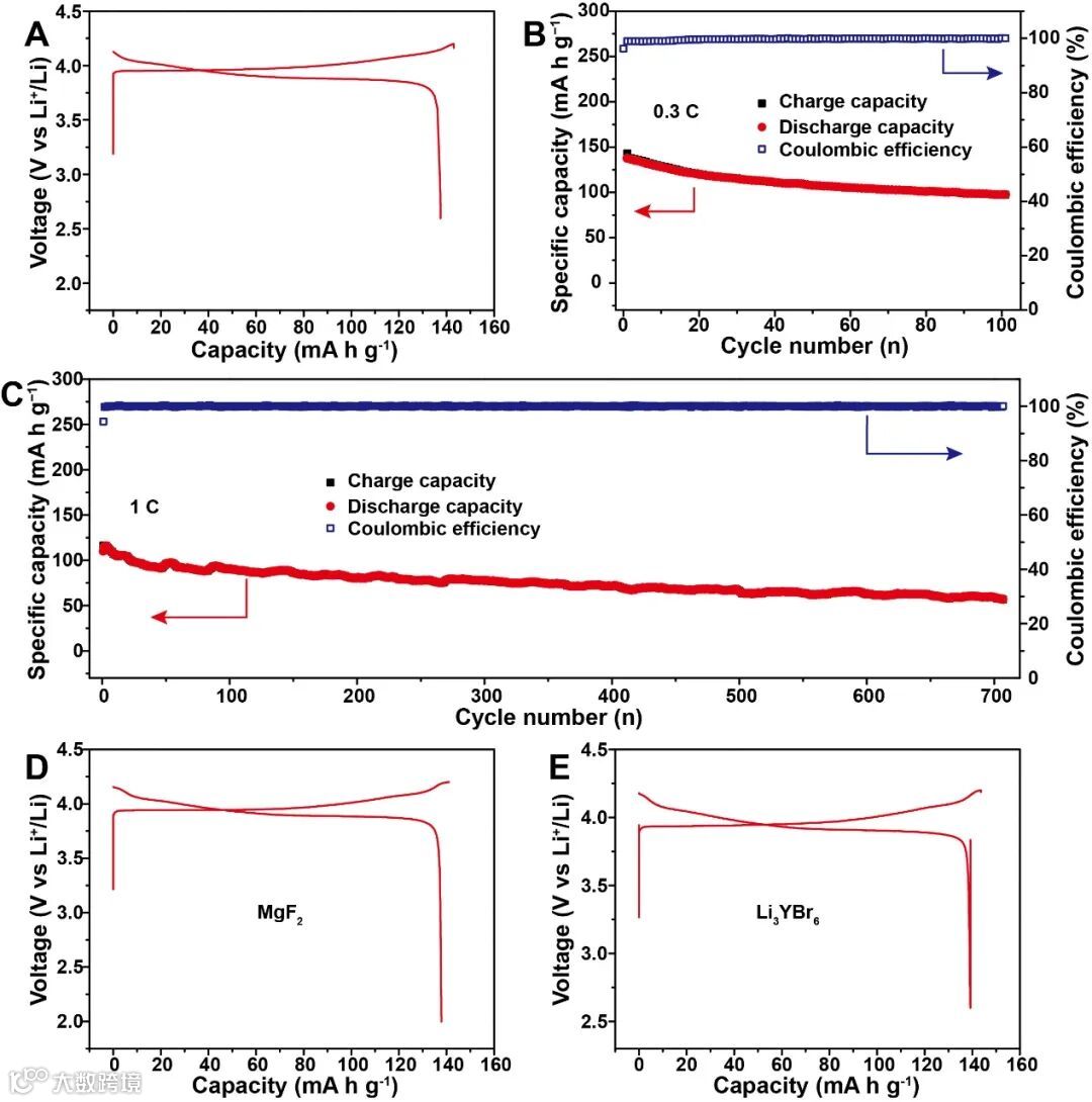 基于该方法组装的全固态金属锂电池表现出优异的电化学性能。Li/LPSC/LIC/LCO全电池,释放出高的首圈容量137.5 mA h g−1和高的首圈库伦效率96%。该电池可以在0.3C的倍率下稳定循环大于100圈,在1C下稳定循环大于700圈。此外,除了LiAlCl4这种卤化物外,其他能与金属锂反应产生合金的物质,如,其他卤化物(Li3HoCl6, Li3YBr6),硫化物(Li10GeP2S12),金属盐(MgI2和MgF2),也可以作为牺牲层中的反应物来构建三维金属锂负极,说明该方法具有一定的普适性。