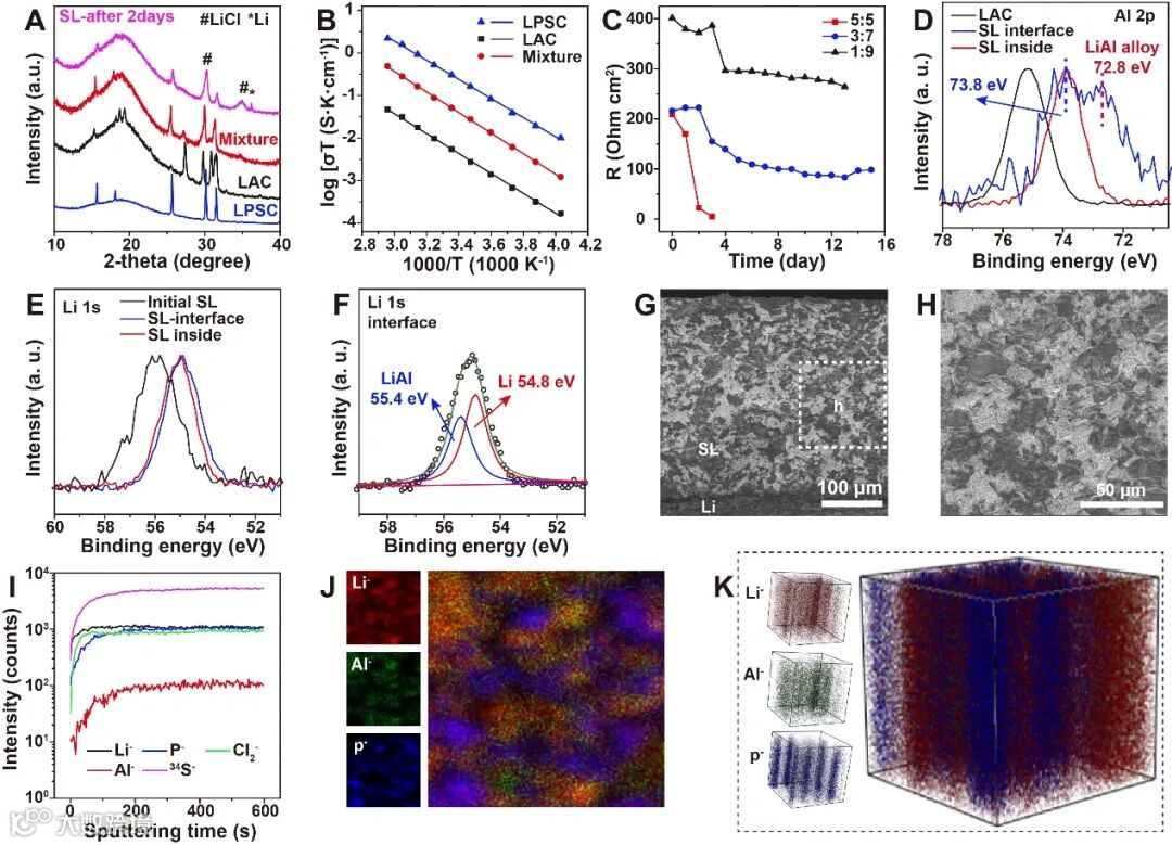 通过XRD观察到牺牲层与金属锂负极反应后,产生了Li-Al合金与LiCl,并且LPSC硫化物电解质保持不变。进一步的XPS结果表明锂化过程在逐步的从外向内进行。SEM和TOF-SIMS的结果展示了形成的三维连续的电子和离子传输通道。
