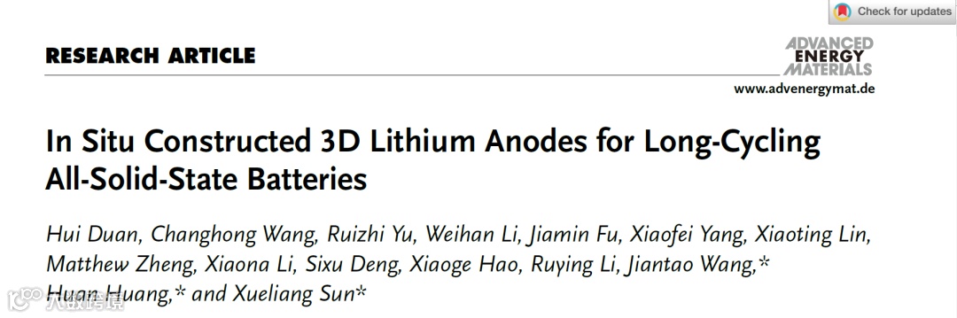 该研究工作以“In Situ Constructed 3D Lithium Anodes for Long-Cycling All-Solid-State Batteries”为题发表在国际知名期刊Advanced Energy Materials上。