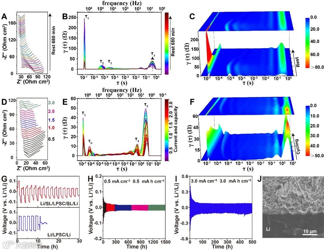 此外,在不同电流密度和沉积容量下工作时,DRT结果展示出稳定的负极/电解质界面。并且,在循环过程中检测到新生成的SEI界面的存在。组装的对称电池可以在0.5 mA cm-2的电流密度和0.5 mA h cm-2的容量下稳定循环1500小时,在3 mA cm-2的大电流密度和3 mA h cm-2的大容量下稳定循环500小时。循环后的金属锂/电解质界面保持平整,没有枝晶状金属锂产生。
