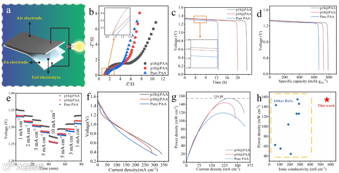 图3.(a)电池测试的三明治结构模拟图;每种凝胶所构成电池的(b)电池阻抗图谱及与x轴交点处放大图、(c)2mA cm-2恒流放电情况及电压对比放大图、(d)以锌消耗量为计算基准的质量比容量对比图、(e)在不同电流密度下的阶梯放电对比图、(f)LSV测试图、(g)功率密度对比图;(h)本研究的凝胶电解质与其它相关研究在离子导率和所组成金属空气电池的功率密度的对比