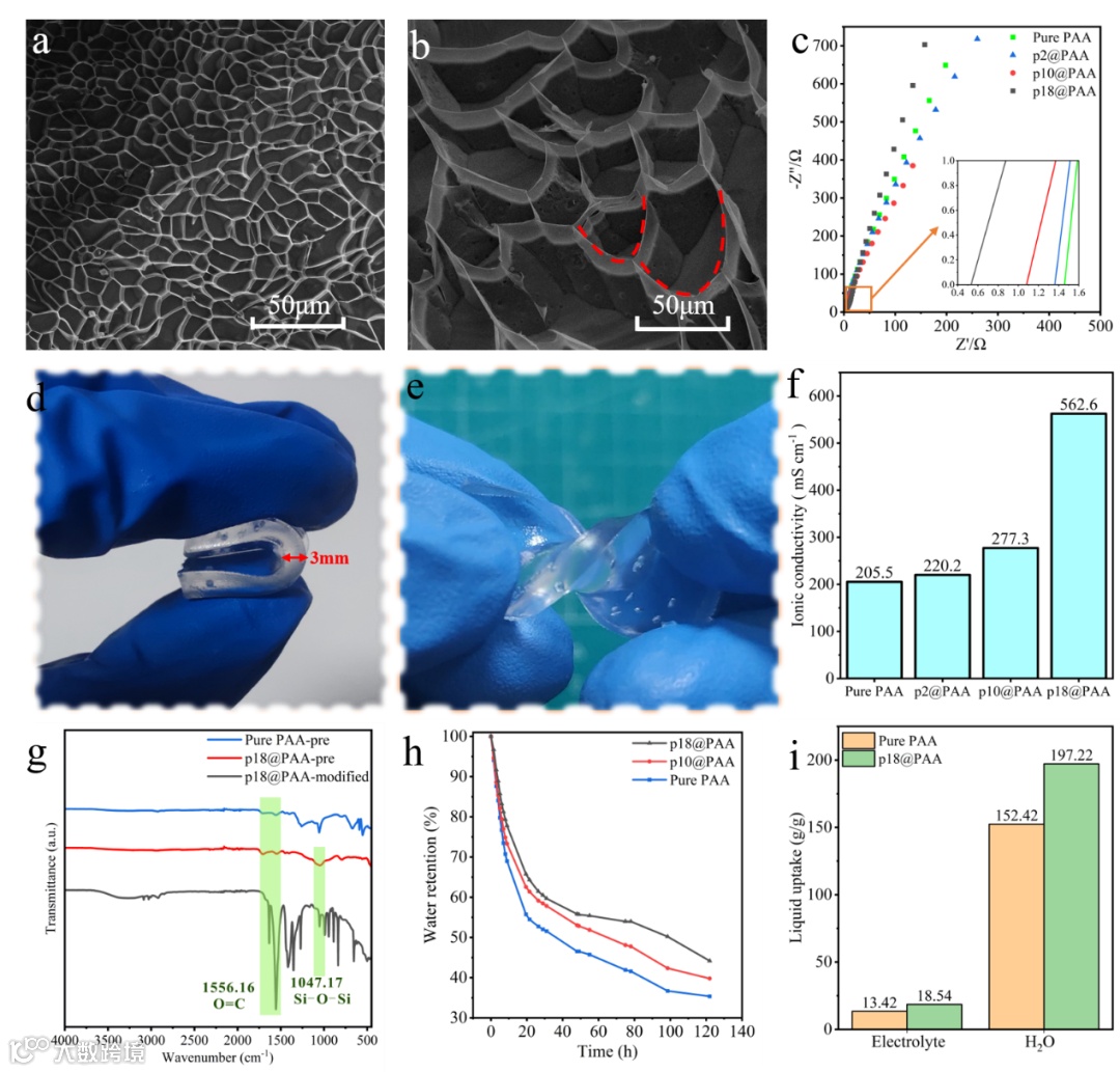 图2.(a)纯PAA凝胶截面冷冻电镜1500倍图像;(b)p18@PAA凝胶截面冷冻电镜1500倍图像;(c)四种不同配比凝胶交流阻抗图及x轴交点放大图;(d-e)p18@PAA电解质凝胶弯折、扭转能力;(f)四种凝胶的离子导率对比;(g)纯PAA凝胶、经处理前的p18@PAA凝胶和处理后p18@PAA凝胶的FT-IR图谱;(h)不同凝胶的水保持能力;(i)两种凝胶对水和电解液的吸收量对比