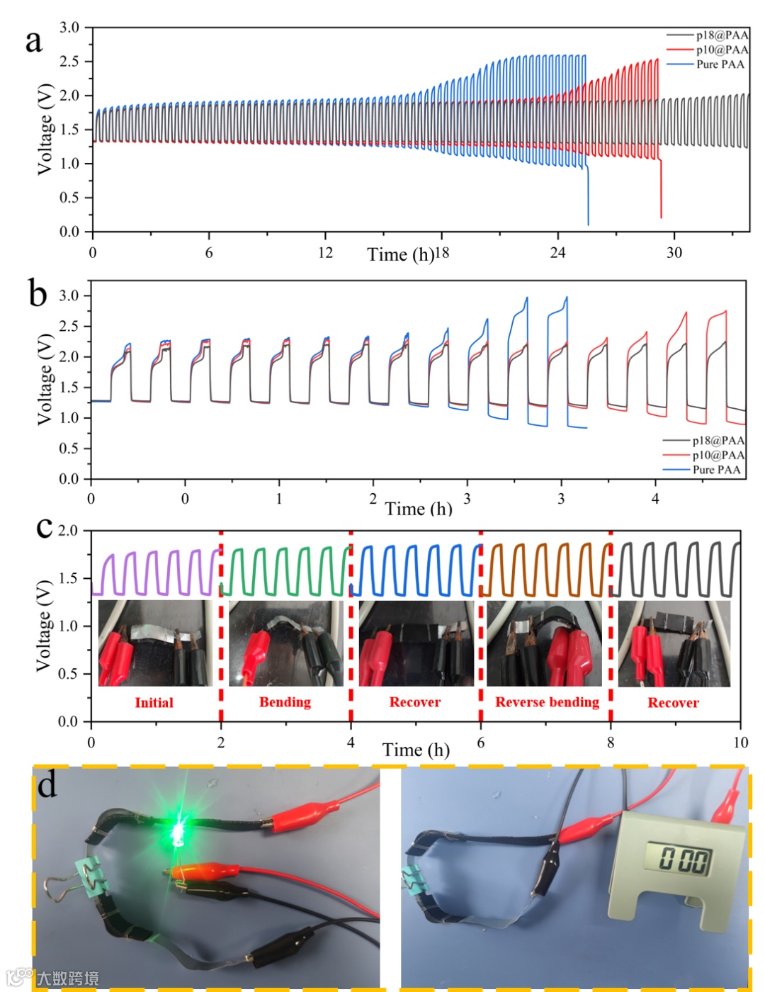 图4. (a)各组电池在10 mA cm-2下的充放电循环性能;(b)各组电池在2 mA cm-2下的充放电循环性能;(c)电池在实际情况中弯折与反向弯折的工作情况;(d)电池在实际情况中应用如LED和电子钟中的表现