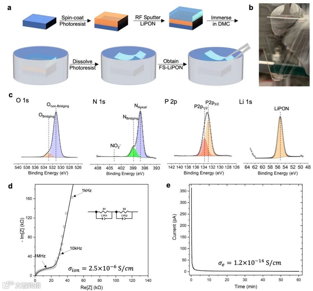 图1. FS-LiPON的合成路线及基本表征。(a) FS-LiPON合成路线图示。(b) 透明柔韧的FS-LiPON照片。(c) FS-LiPON薄膜的XPS图谱。(d) FS-LiPON薄膜的EIS谱。(e) FS-LiPON薄膜的直流极化测试结果。
