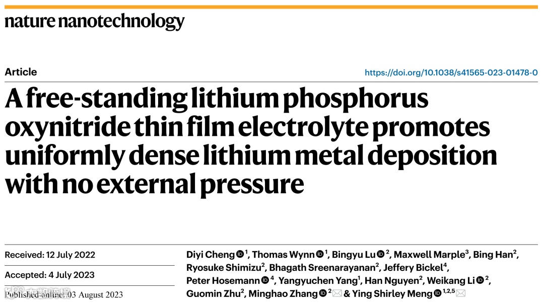 D. Cheng, M. Zhang, Y.S. Meng et al.“A free-standing lithium phosphorus oxynitride thin film electrolyte promotes uniformly dense lithium metal deposition with no external pressure”, Nat. Nanotechnol. 2023,