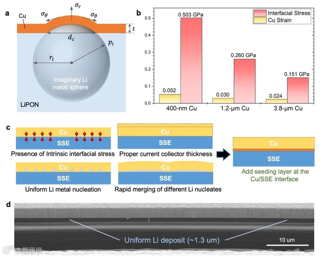 图4. 界面应力分析以及均匀锂金属沉积的要求。(a) FS-LiPON Li/Cu电池界面应力分析模型的图示。(b) 不同Cu厚度情况下的Cu应变及界面应力计算结果。(c) 达到均匀锂金属沉积的要求。(d) Li/Cu电池的截面SEM图像显示了增加金籽晶层后达到了均匀致密的锂金属沉积。