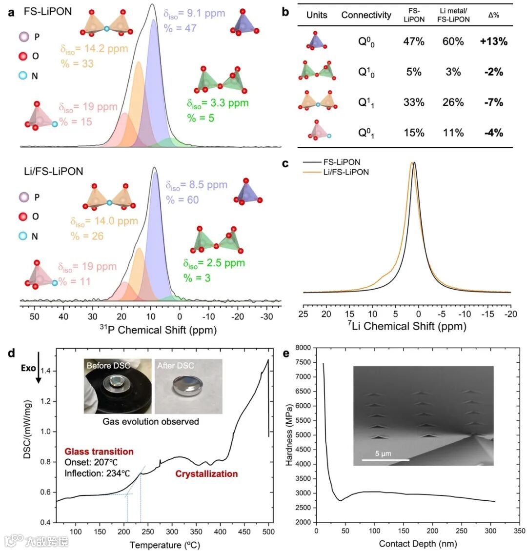 图2. FS-LiPON的界面化学表征,热学性质和力学性质。(a) Li/FS-LiPON界面样品的31P固态核磁共振图谱。(b) 31P固态核磁共振分析结果对比。(c) Li/FS-LiPON界面样品的 7Li固态核磁共振图谱。(d) FS-LiPON的示差扫描量热结果。(e) FS-LiPON薄膜的纳米压痕测试结果。