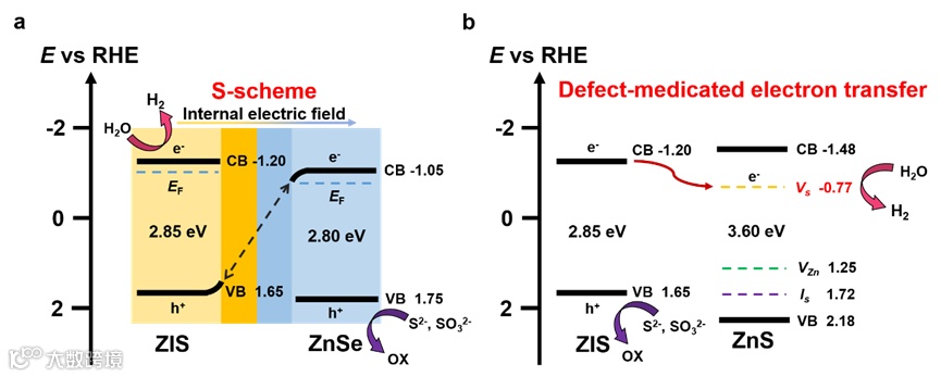 通过对光催化剂进行能带结构的测试分析,可知ZIS/ZnSe HNSs在可见光照下,由于材料间电荷的定向移动,于二者构建的异质结界面处形成内建电场,随后诱导载流子进行分离,形成特殊的S机制电荷迁移路径。相比之下,ZIS/ZnS HNSs中,由于在可见光照下,ZnS中的S空位对ZIS导带上的电子进行捕获,故形成缺陷诱导的电子捕获路径。本研究结果为实现光催化有效的分解水制氢提供了指导思想。