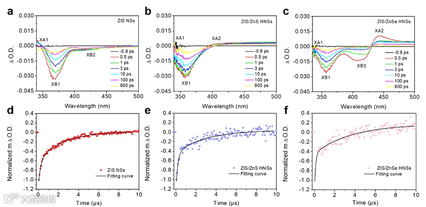 本研究结合飞秒和纳秒瞬态光谱技术详细的揭示了具有S机制的异质结光催化剂(ZIS/ZnSe HNSs)的载流子转移机制,并与具有缺陷诱导的电子捕获途径的光催化剂(ZIS/ZnS HNSs)进行对比分析,发现在该研究体系中,S机制的电荷转移路径比缺陷诱导的电子捕获途径获得更为有效的电荷分离效率,并且,ZIS/ZnSe HNSs中由内建电场形成的S-scheme机制表现出超长的载流子分离寿命(3.58 μs)。该研究成果也为进一步确定光催化活性和光诱导载流子转移途径之间的关系铺平了道路。