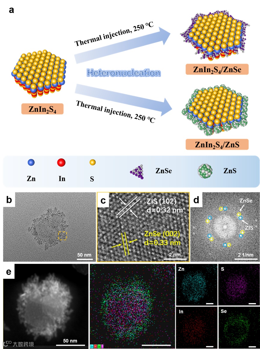 图2. 多元纳米晶的合成过程示意图和ZnIn2S4/ZnSe异质结纳米片的形貌表征。