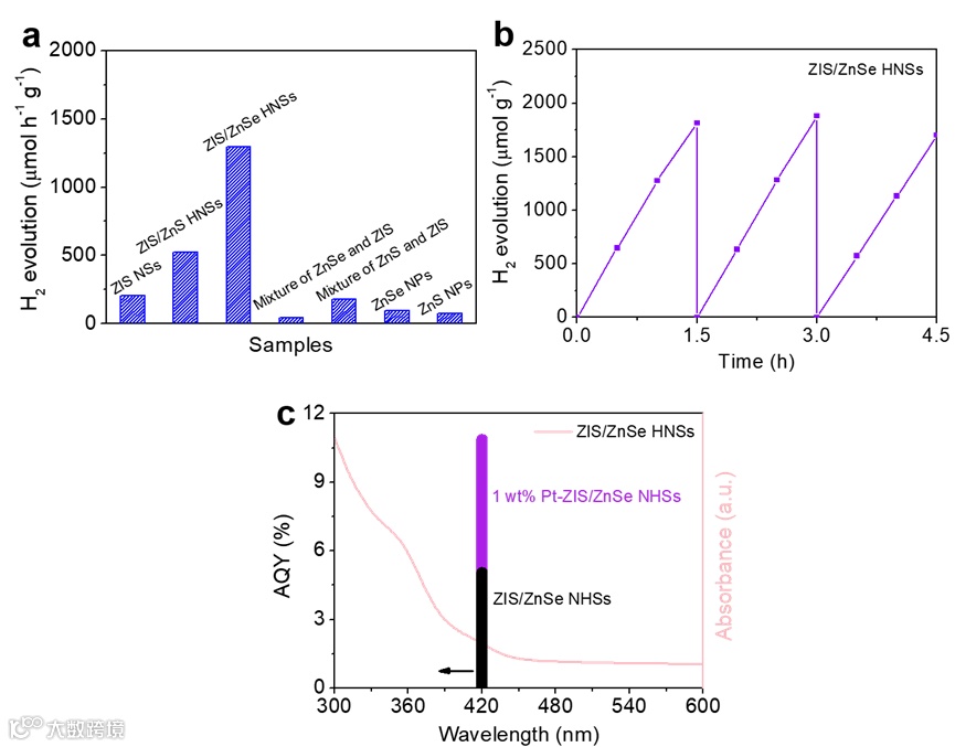 研究发现,在可见光(波长大于420 nm)照射下,具有S机制电荷分离路径的ZIS/ZnSe HNSs的析氢速率(1296.9 μmol h-1 g-1)分别是具有缺陷诱导的电子捕获途径的ZIS/ZnS HNSs(525.2 μmol h-1 g-1)和纯ZIS NSs(204.4 μmol h-1 g-1)的2.47倍和6.34倍。此外,本研究还通过添加助催化剂铂(Pt),进一步促进材料间电荷的分离效率,使得1 wt% Pt-ZIS/ZnSe HNCs在420 nm处的表观量子效率(AQY)高达10.9%,析氢速率为3332.2 μmol h-1 g-1。
