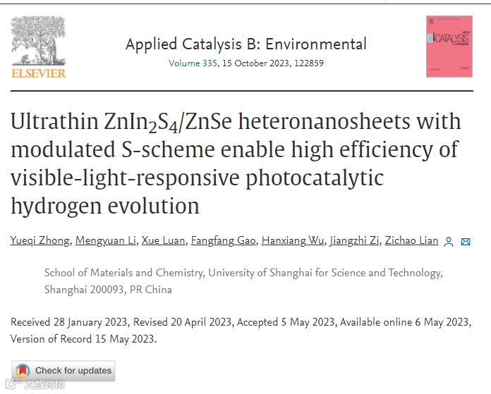 近日,来自上海理工大学的廉孜超教授,在国际知名期刊Applied Catalysis B: Environmental上发表题为“Ultrathin ZnIn2S4/ZnSe Heteronanosheets with Modulated S-Scheme Enable High Efficiency of Visible-Light-Responsive Photocatalytic Hydrogen Evolution”的观点文章。
