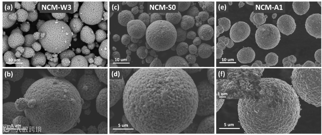 图 3 (a-b)水洗NCM83、(c-d)原始NCM83和(e-f)湿空气暴露NCM83在不同放大倍数下的SEM图像。