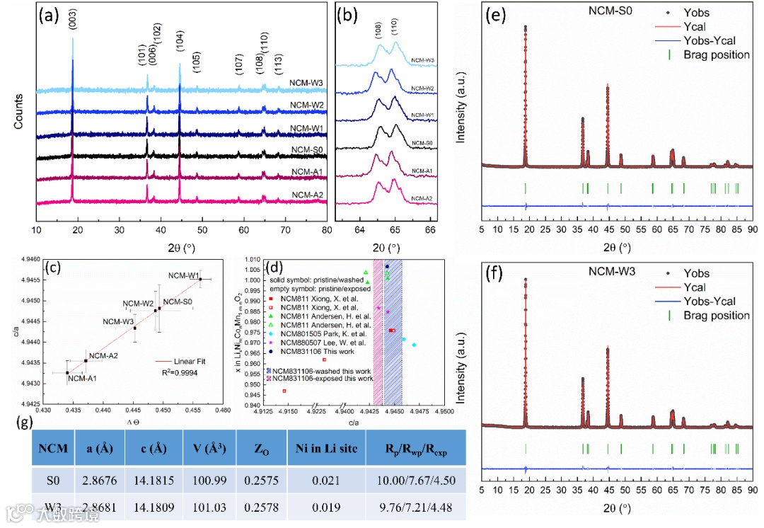图 2(a)不同NCM83的XRD衍射。(b)(108)峰和(110)峰区域的XRD图谱。(c)通过公式1计算出的不同NCM83的晶格参数c/a比和(108)、(110)峰间距的关系。(d)不同NCM83的c/a比和锂含量同文献中相似富镍层状材料的对比。(e)原始NCM83(NCM-S0)的XRD精修图谱和拟合。(f)NCM-W3的XRD精修图谱和拟合。(g)XRD精修得到的NCM-S0与NCM-W3晶格参数、氧原子位置和Li/Ni混排度。