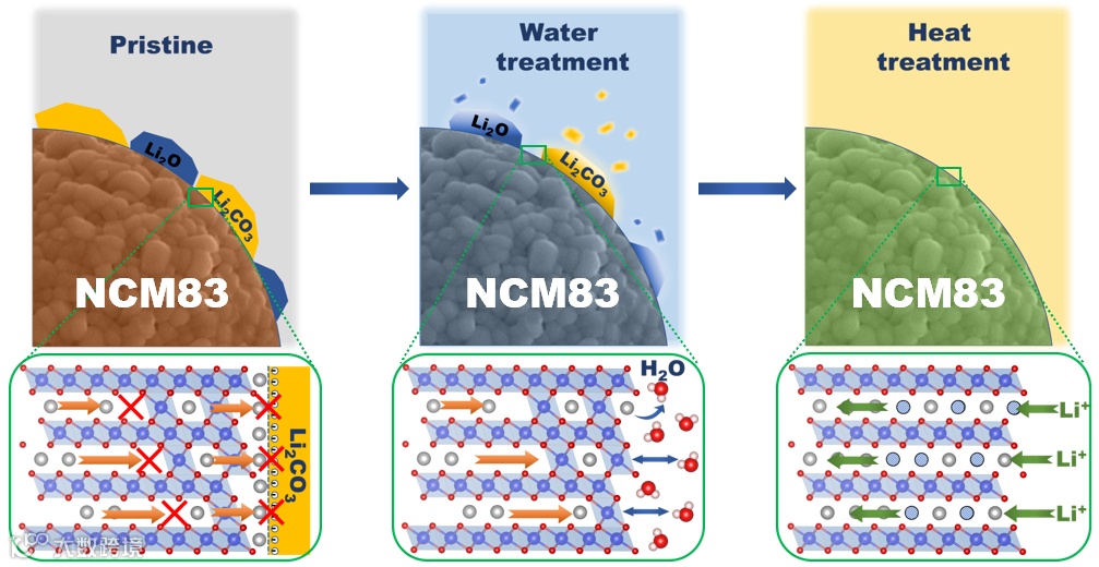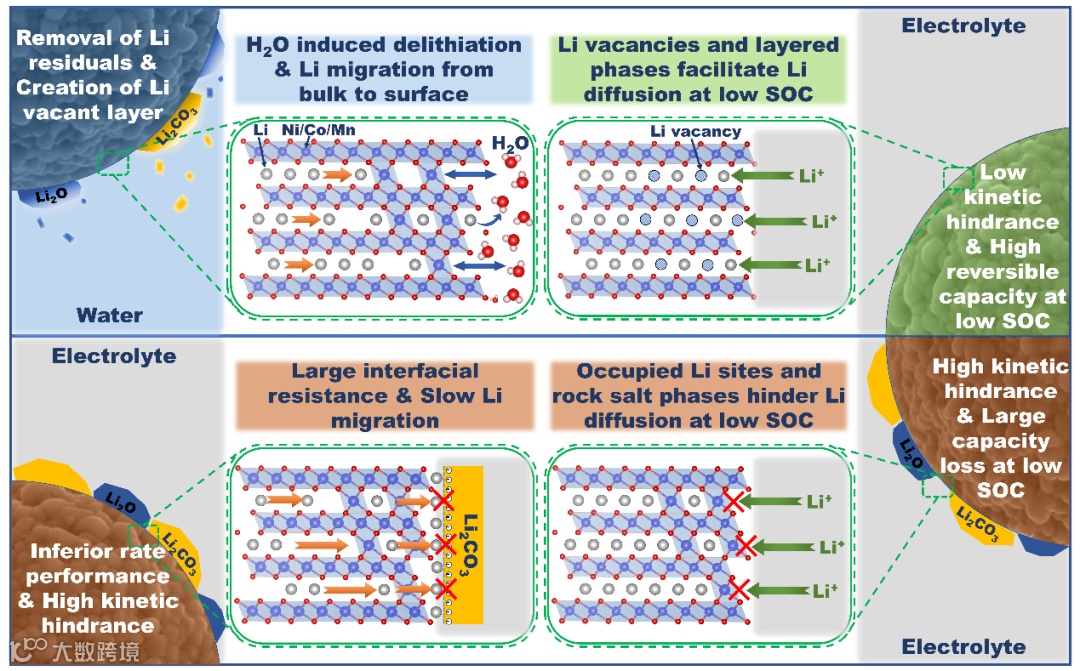 图 9 示意图显示了水洗后NCM83表面Li残留物和晶体结构的演变,以及Li残留物/Li空位对NCM83电化学性能的影响。