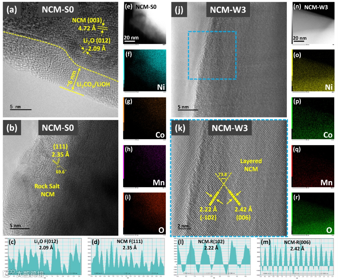 图 8. (a)被Li残留物覆盖的NCM-S0,(b)表面具有LixNi1-xO型岩盐结构的NCM-SO的HRTEM。(c)NCM-S0表面Li2O的(012)晶面间距,(d)NCM-SO表面LixNi1-xO型岩盐结构的(111)晶面间距。(e-i)NCM-S0的STEM暗场图像和EDS图谱。(j)NCM-W3表面的HRTEM,没有锂残留物(k)(j)中蓝色正方形区域中的表面晶体结构的近距离图像。(l)NCM-W3表面层状结构(102)晶面的晶面间距。(m)NCM-W3表面层状结构(006)晶面的晶面间距。(n-r)NCM-W3的STEM暗场图像以及EDS图谱。