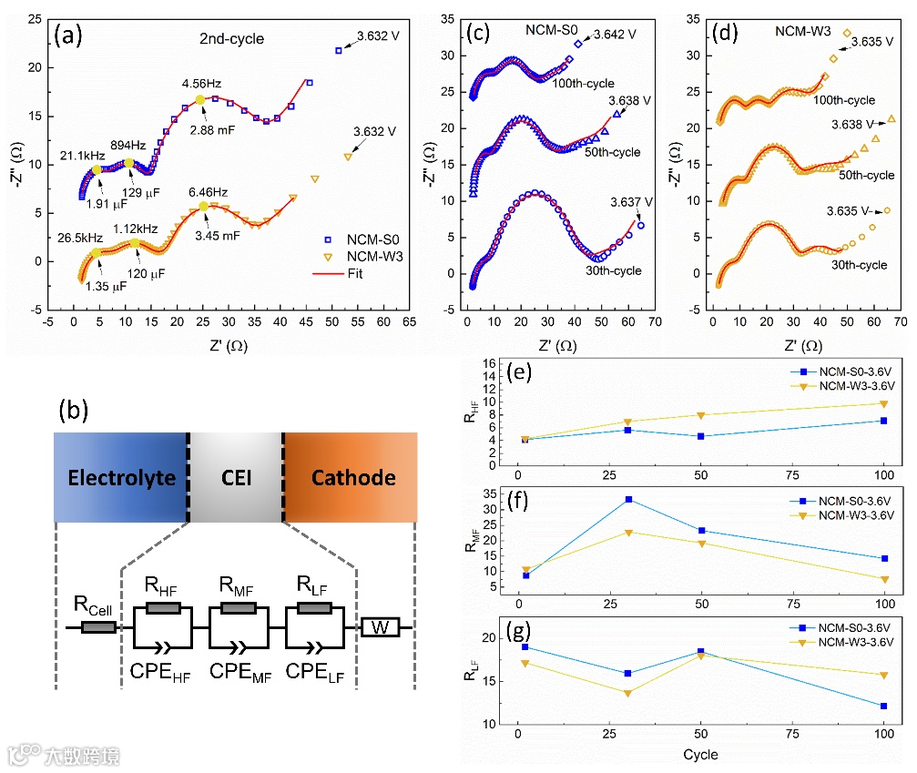 图 6 (a) NCM-S0和NCM-W3在第二周充电循环期间在3.632 V vs Li/Li+的EIS图谱,并通过等效电路拟合。(b) 显示等效电路的示意图,该等效电路描述了正极侧不同区域的离子传输。(c)NCM-S0和(d)NCM-W3在不同充电循环期间~3.6 V下的EIS,并通过等效电路拟合。NCM-S0和NCM-W3的(e)RHF(f)RMF(g)RLF随循环的变化。