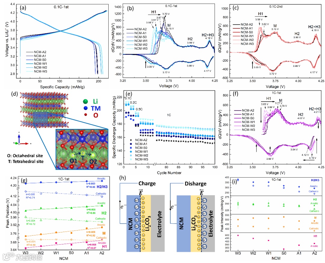 图 4 (a) 不同NCM83的首周循环电压曲线。(b) 不同NCM83的首周循环dQ/dV与V的曲线。(c) 不同NCM83的第二周循环dQ/dV与V的曲线。(d) 示意图显示了Li在层状NCM83s中的扩散机制。(e) 不同NCM83的倍率和循环性能。(f) 不同NCM83在1C下的第一周循环dQ/dV与V的曲线。(g) (f)中所示的不同NCM83s的电化学氧化还原峰的峰位总结。(h) 示意图显示了在充电/放电过程中Li2CO3对正极/电解液界面Li传输的抑制以及界面空间电荷层和电场的形成。(i) (f)中所示的不同NCM83s的电化学氧化还原峰的峰值强度的总结。