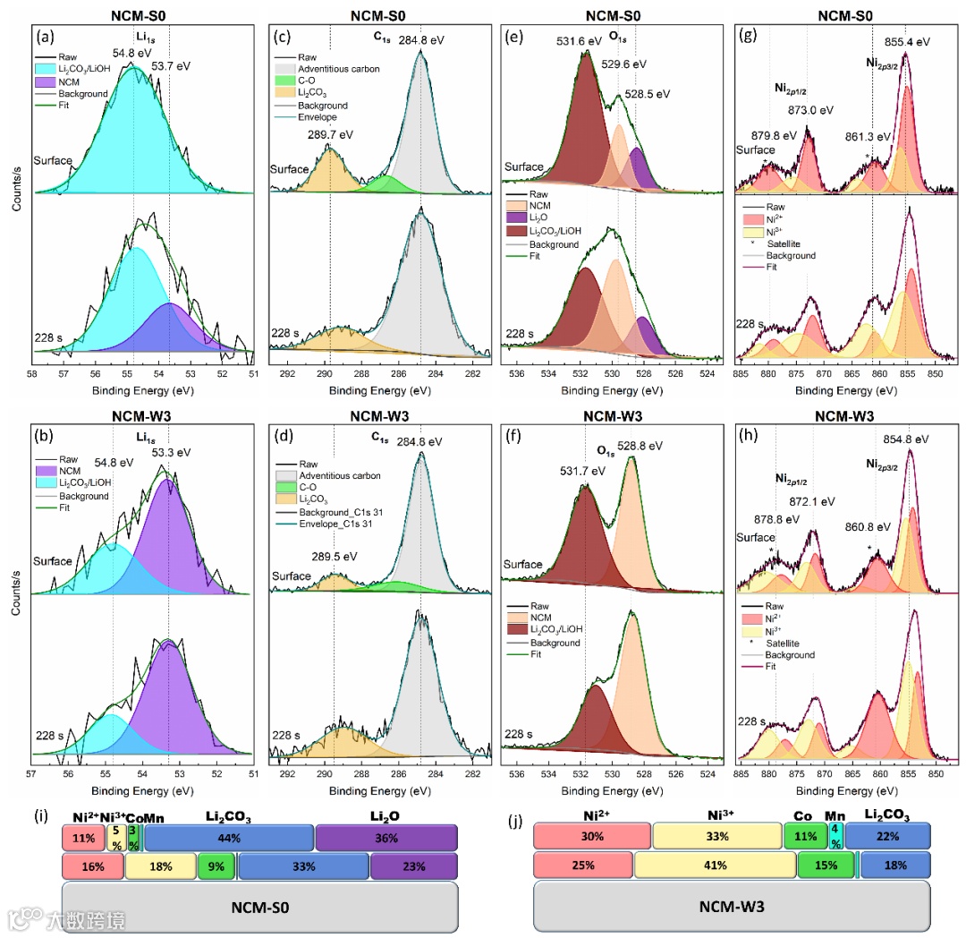 图 7. (a)NCM-S0和(b)NCM-W3的XPS Li1s光谱。(c)NCM-S0和(d)NCM-W3的C1s光谱。(e)NCM-S0和(f)NCM-W3的O1s光谱。(g)NCM-S0和(h)NCM-W3的Ni2p光谱。(i)NCM-S0和(j)NCM-W3表面化学成分的百分比。
