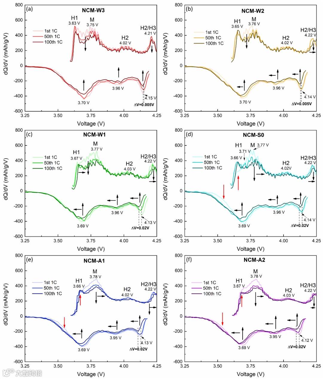 图 5 (a)NCM-W3、(b)NCM-W2、(c)NCM-W1、(d)NCM-S0、(e)NCM-A1、(f)NCM-A2在不同循环下的dQ/dV vs V曲线。