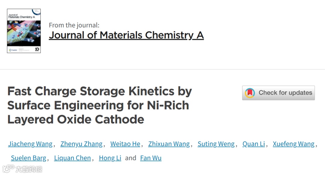 Jiacheng Wang, Zhenyu Zhang, Weitao He, Zhixuan Wang, Suting Weng, Quan Li, Xuefeng Wang, Suelen Barg, Liquan Chen, Hong Li, and Fan Wu* Fast Charge Storage Kinetics by Surface Engineering for Ni-Rich Layered Oxide Cathode. Journal of Materials Chemistry A.2023.