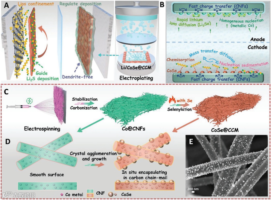 该观点文章设计了一种高效的双功能CoSe电催化剂并使其原位包覆在碳链甲中,作为同时调控正极和负极内部反应的纳米反应器。碳包覆层与碳纳米纤维交联形成的碳链甲保护了CoSe免受电池内部化学反应环境的腐蚀,保证了CoSe在长期循环中的高活性。