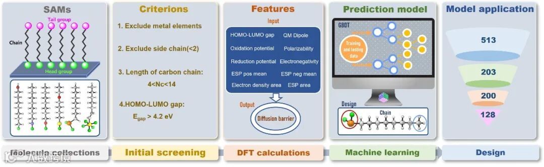 研究人员利用机器学习方法揭示了自组装分子的结构特征(头基团、尾基团和中间基团)以及电子性质与人工界面层性能之间的构效关系,其中分子的QM偶极矩和静电势被确定作为关键描述符用来预测界面层锂离子迁移能垒。