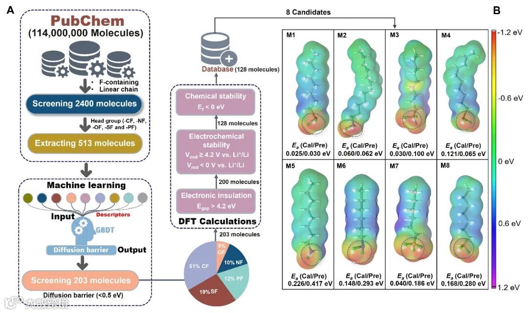 该研究所应用的高通量数据驱动工作流程,交叉融合了密度泛函理论和机器学习方法。主要筛选流程包含自组装分子结构特征、分子的电化学稳定性、化学稳定性和离子导电性等筛选准则。基于这些筛选准则,可以自动从PubChem数据库中捕获性能优异的含氟有机分子。这种新的研究范式加速了最优含氟有机分子的筛选进程,通过数据驱动实现了锂金属负极人工界面层设计与构筑。