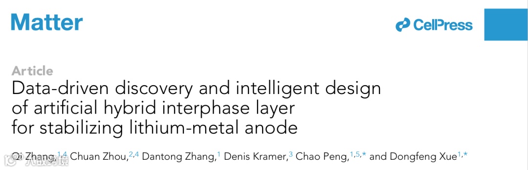 近日,来自中国科学院深圳先进技术研究院薛冬峰研究员和彭超副研究员,在Cell旗下国际知名期刊Matter上发表题为“Data-driven discovery and intelligent design of artificial hybrid interphase layer for stabilizing lithium-metal anode”的研究论文。该研究融合了第一性原理计算和先进的人工智能方法,并利用分子自组装技术构建出一种新型的有机-无机人工界面层,其赋予锂金属负极界面良好的机械稳定性和离子导电性,此策略可诱导锂均匀沉积并抑制枝晶生长。