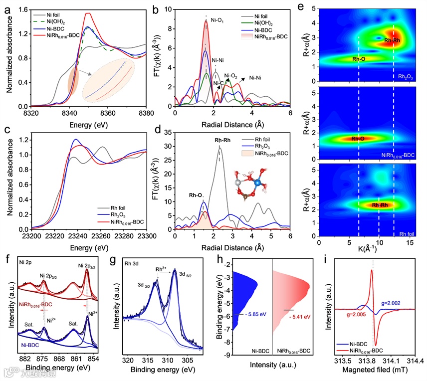 图 3. (a) Ni K 边 XANES 和 (b) Ni 箔、Ni(OH)2、Ni-BDC 和 NiRh0.016-BDC 的 Ni K 边 EXAFS 光谱。(c) Rh K 边 XANES,和 (d) Rh 箔、Rh2O3 和 NiRh0.016-BDC 的 Rh K 边 EXAFS 光谱。(e) Rh 箔、Rh2O3 和 NiRh0.016-BDC 的 WT-EXAFS 光谱。(f) Ni-BDC 和 NiRh0.016-BDC 的 Ni 2p 的 XPS 光谱。(g) NiRh0.016-BDC 的 Rh 3d 的 XPS 光谱。(h) Ni-BDC 和 NiRh0.016-BDC 的表面价带光谱。(i) Ni-BDC 和 NiRh0.016-BDC 的 ESR 谱。