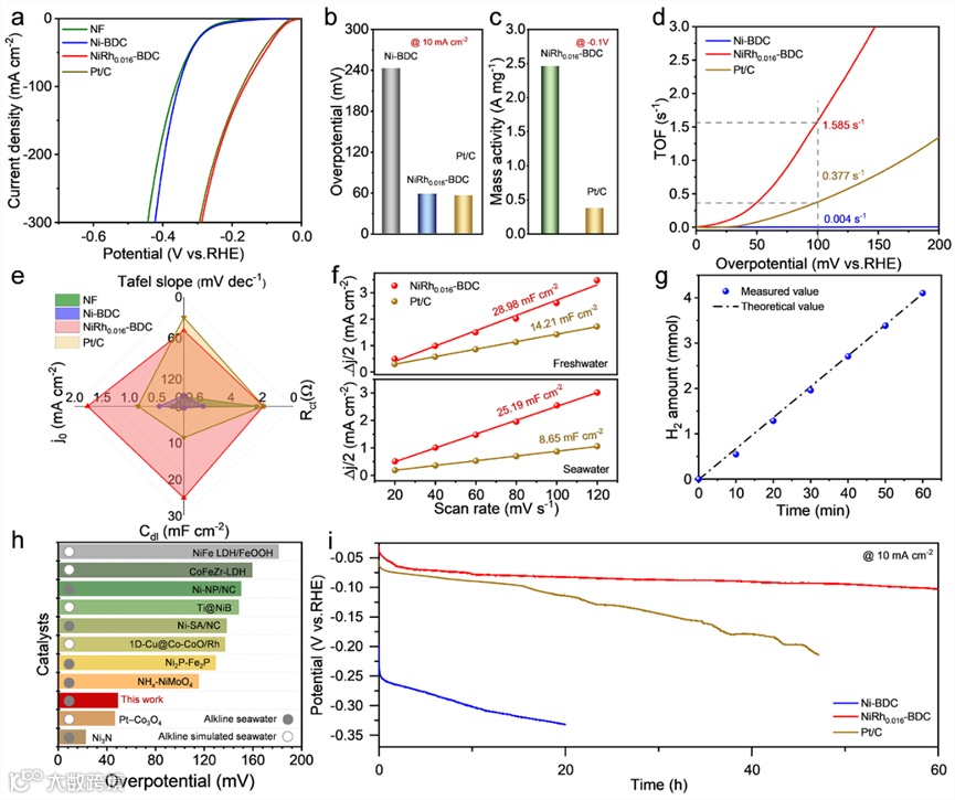 图 4. (a) 碱性海水中NF、Ni-BDC、NiRh0.016-BDC和Pt/C的HER的LSV 曲线(具有95% iR补偿)。(b) 过电势 (η10),(c) 质量活性 (@-0.1V) 和 (d) Ni-BDC、NiRh0.016-BDC和Pt/C的TOF值。(e)雷达图显示了塔菲尔图、NF、Ni-BDC、NiRh0.016-BDC和Pt/C的Rct、Cdl和j0值。(f) NiRh0.016-BDC和Pt/C在碱性淡水和海水中的Cdl。(g) 通过实验测量和理论计算确定的NiRh0.016-BDC的析出氢。(h) 最近报道的HER催化剂在10 mA cm-2下的过电势。(i) Ni-BDC、NiRh0.016-BDC和Pt/C在碱性海水中10 mA cm-2 的计时电位测试。