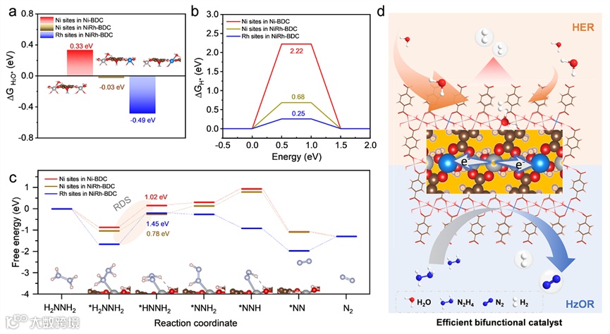 图 6. (a) H2O在Ni-BDC和NiRh-BDC表面吸附的吉布斯自由能 (ΔGH2O)。(b) 平衡电位下H*中间体在的Ni-BDC(Ni位点)、NiRh-BDC(Ni位点)和NiRh-BDC(Rh位点)上吸附的吉布斯自由能图。(c) Ni-BDC(Ni位点)、NiRh-BDC(Ni位点)和NiRh-BDC(Rh位点)的HzOR反应过程的自由能曲线。(d) NiRh-BDC表面的HER和HzOR反应机制示意图。