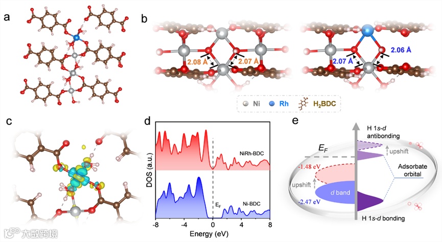 图 1. (a) NiRh-BDC 优化结构的顶视图。(b) Ni-BDC和NiRh-BDC优化结构的前视图,其中描绘了Ni-O键的键长。(c) NiRh-BDC局部电荷密度变化的等值面,其中黄色表示电子积累,蓝色表示电子耗尽。(d) Ni-BDC 和 NiRh-BDC 的DOS图。(e) 用DOS示意图说明d带中心的位置对H*与催化剂之间相互作用的影响。