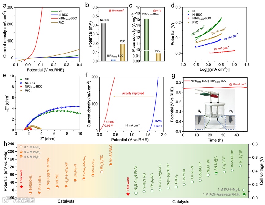 图 5. (a) 在1 M KOH + 0.3 M N2H4电解质中,NF、Ni-BDC、NiRh0.016-BDC和Pt/C的HzOR的LSV曲线(具有95% iR补偿)。(b) Ni-BDC、NiRh0.016-BDC和Pt/C的过电势 (η10) 和 (c) 质量活性 (@-0.1V)。(d) Tafel 图和 (e) NF、Ni-BDC、NiRh0.016-BDC和Pt/C的电化学阻抗。(f) 在1 M KOH+ 0.3 M N2H4电解液和1 M KOH电解液中分别以NiRh0.016-BDC作为阴极和阳极的双电极电池的LSV曲线(95% iR补偿) (g) 计时电位测试在10 mA cm−2下在1 M KOH+ 0.3 M N2H4电解质中配置的双电极电池。(h) 最近报道的催化剂在10 mA cm− 2 时的HzOR过电势(左)和OHzS电池电压(右)。(g)的插图显示了我们配置的双电极电池的数码照片。