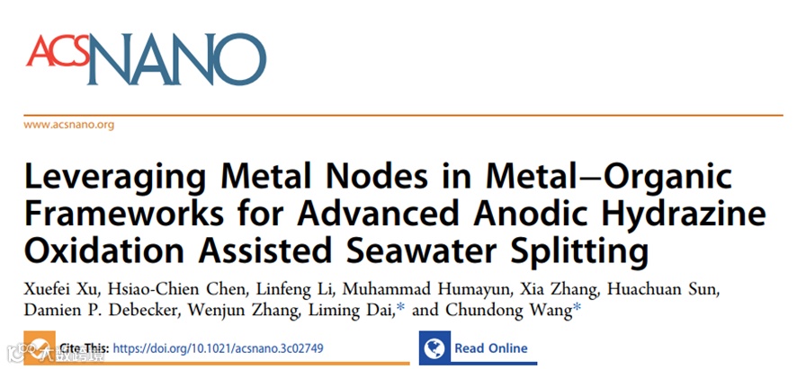 基于此,华中科技大学王春栋团队联合新南威尔士大学戴黎明团队在ACS Nano上发表题为“Leveraging Metal Nodes in Metal−Organic Frameworks for Advanced Anodic Hydrazine Oxidation Assisted Seawater Splitting”的研究文章。