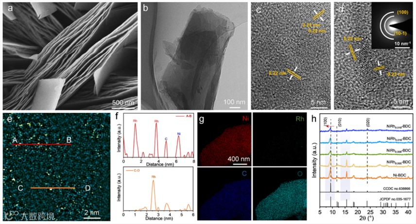 图 2. NiRh0.016-BDC的FESEM图像(a)和TEM图像(b)。(c) Ni-BDC (d) NiRh0.016-BDC的HRTEM图像(插图是NiRh0.016-BDC的SADE模式)。(e)NiRh0.016-BDC的FFT-HADDF-STEM图像。(f)图(e)中所示的线A-B和C-D的相应强度分布。(g)NiRh0.016-BDC的Ni、C、Rh和O元素的元素映射图像。(h) Ni-BDC和NiRhx-BDC的XRD图。