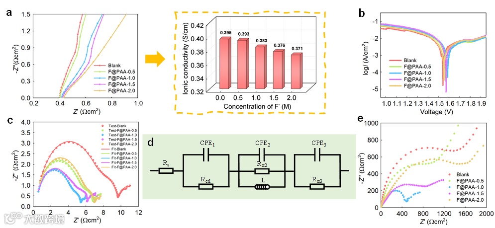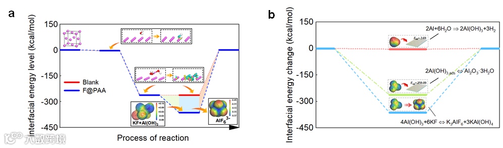 作者们还在电池放电前后,进行了铝阳极-F@PAA水凝胶电解质界面的电化学和材料特性分析。结果表明,1.0 M F-能够最大程度腐蚀寄生产物形成的钝化层、疏通铝表面离子传输通道。这从微观角度揭示了F-对Al(OH)3的竞争性分解作用。