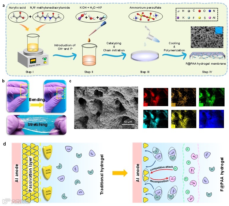 图1. F@PAA水凝胶电解质的制备、物化性质及分解寄生产物Al(OH)3的原理。