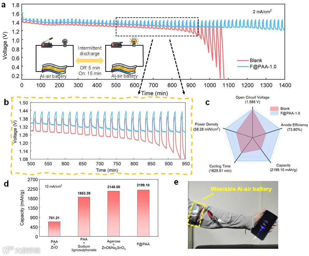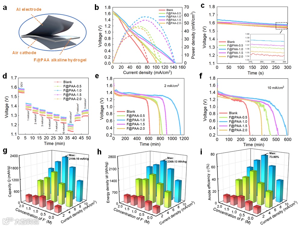 图4. 使用F@PAA水凝胶电解质的铝-空气电池的电化学性能