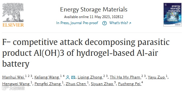 近日,来自北京理工大学的王克亮副教授,在国际知名期刊Energy Storage Materials上发表题为“F- competitive attack decomposing parasitic product Al(OH)3 of hydrogel-based Al-air battery”的文章。