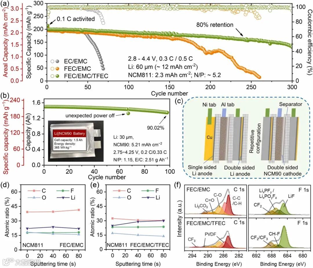 首先使用60μm的锂(~12 mAh cm−2)、高负载的NCM811阴极(~2.3 mAh cm−2)和40μL电解液组装扣式电池,N/P比约为5.2。使用FEC/EMC/TFEC不易燃电解质的电池表现出令人印象深刻的稳定循环性能,显示出有限的极化,在240次循环后容量保持率达到80%。在接近工业条件下(N/P:1.15,E/C:2.51 g Ah−1 ),使用超薄(30μm)锂金属阳极和超高负载(每侧:~5.21 mAh cm−2 )NCM90阴极组装了一个软包电池,其容量高达 1.5 Ah,能量密度高达 365 Wh kg−1 。该软包电池使用不易燃的FEC/EMC/TFEC电解液,在98个循环后具有90.02%的高容量保持率。