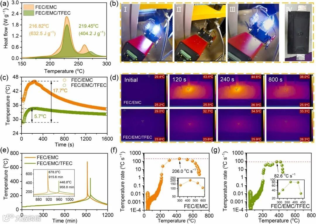 图1. 低放热设计的不易燃的电解质显著改善商业锂离子软包电池在滥用条件下的安全性,并通过形成优越的富氟固态电解质界面实现锂金属电池的稳定循环。