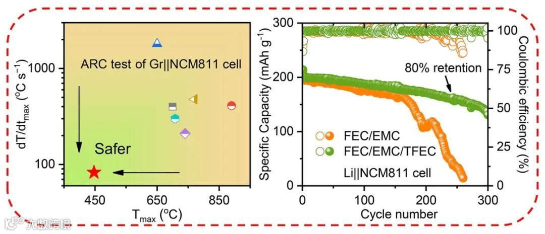 尽管证明了电解质的不可燃性,但应评估使用FEC/EMC/TFEC电解质的电池的安全性。将不同的电解质注入商用Gr||LiNi0.5Co0.2Mn0.3O2 (NCM523)干软包电池,以评估其在实际和滥用条件下的安全性。在针刺测试下,使用上述不可燃电解液的商业锂离子软包电池的发热明显减少。绝热加速量热试验(ARC)进一步证明了这种精心设计的电解质增强了软包电池的热安全性。对于Gr||NCM811软包电池,这种方法可以在热失控过程中,将最高温度明显降低三分之一(446.8℃ vs 680.0℃),最大升温速率降低50%以上(82.6℃ s−1 vs 206.0℃ s−1 )。我们的工作取得了令人印象深刻的成果,与其他基于ARC测试的电池安全性能的类似工作相比,表现出了突出的竞争力。此外,我们还通过DSC测试比较了不同电解质的锂金属阳极的热释放。研究结果表明,TFEC的引入可以有效地减少热量释放,推迟放热反应的发生(峰值温度从174.88℃增加到210.09℃)。