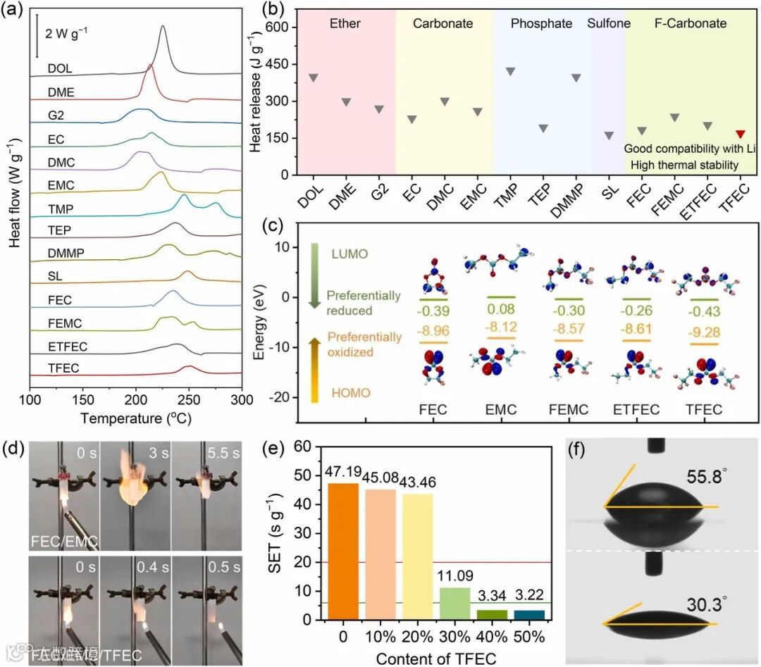 然而,电池的安全性通常会随着其能量密度的增加而恶化。一般来说,液态电解质中高度可燃的有机溶剂大大增加了电池在恶劣条件下(如短路、过热、穿刺等)的危害,导致热失控和爆炸等严重的安全问题。此外,对于锂金属电池(LMB)来说,高活性金属锂和电解质之间的持续寄生反应导致了不均匀的固体-电解质界面(SEI)、多孔锂沉积和枝晶结晶的形成。这些问题会导致低库仑效率(CE),并由于枝晶物刺穿隔膜而带来短路的风险。开发不可燃电解质是提高电池的安全性的有效途径。遗憾的是,现有的研究大多只关注电解液的可燃性,缺乏对电极与电解液之间反应性的系统分析和电池层面的安全性评价,一些报道的不可燃电解质甚至可能导致电池级安全性能下降。