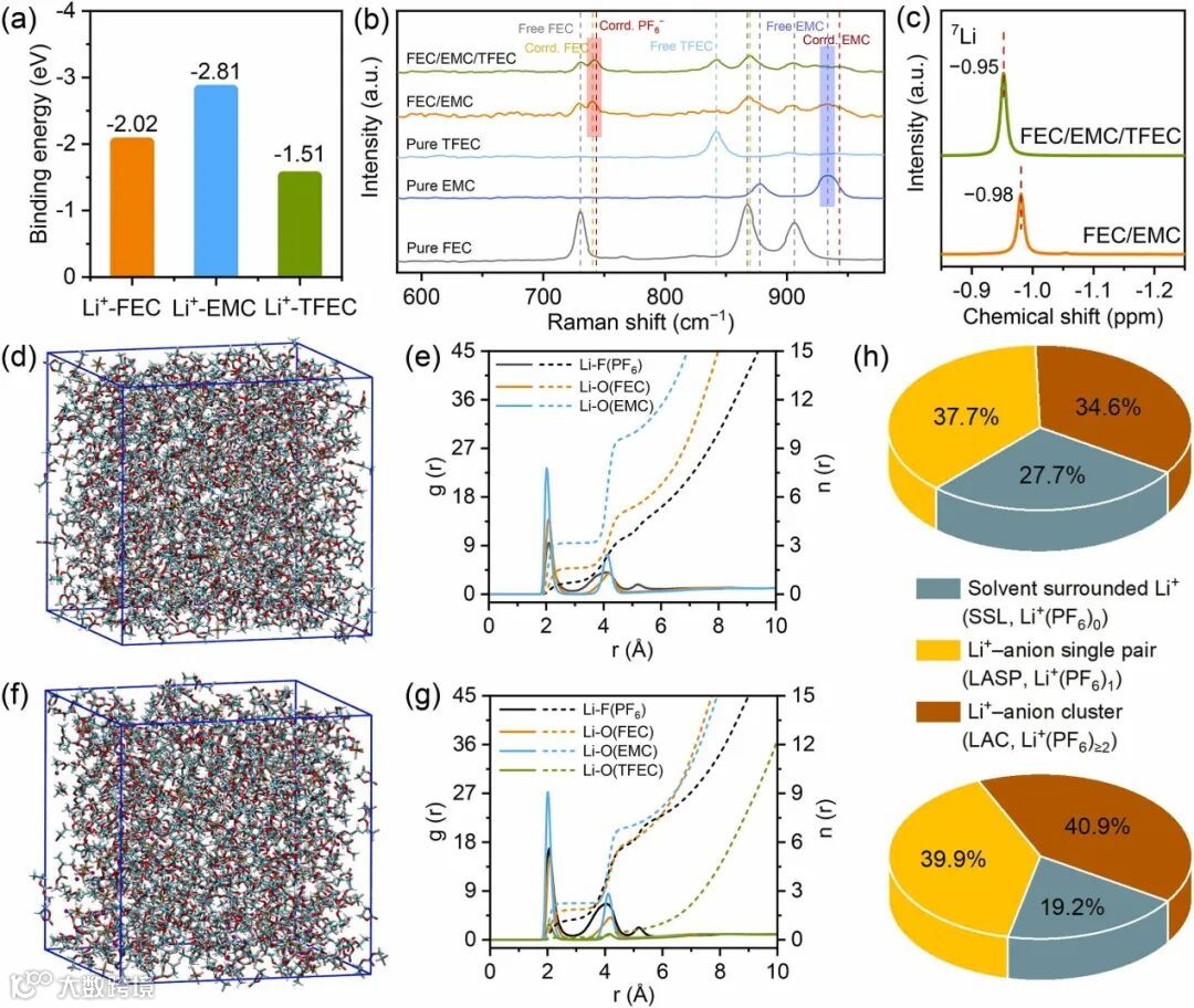 实验表征(核磁、拉曼)和理论研究(DFT计算、MD模拟)表明TFEC和Li+ 之间的结合相对较弱(结合能:EMC(-2.81 eV)>FEC(-2.02 eV)>TFEC(-1.51 eV)),是一种弱溶剂化溶剂,很少参与Li+ 的溶剂化结构。随着TFEC的引入,Li+ 周围的电子密度下降。Li+ 和溶剂在溶剂化结构中的相互作用被削弱,但与阴离子的相互作用被增强,促进了局部高浓度结构和富阴离子溶剂化结构的形成。第一溶剂化壳中Li+ 的配位数也支持这一结果。对于FEC/EMC电解质,发现Li+ 与EMC、FEC和PF6− 阴离子的配位数分别为3.16、1.62和0.75。作为比较,对于FEC/EMC/TFEC电解质,发现Li+ 与EMC、FEC、PF6−阴离子和TFEC的配位数分别为2.25、1.87、1.24和0.15。这有利于减少EMC溶剂的分解,形成一个富含氟的阴离子衍生界面层,从而提高离子的传输和电池的循环性能。此外,三种类型的Li+ 溶解物已经被定义,它们的分布提供了更多的信息。即溶剂包围的Li+(SSL)、Li+ -阴离子单对(LASP)和Li+ -阴离子簇(LAC),在它们的主要溶剂化鞘中Li+ 配位阴离子的数量分别为0、1和≥2 。与FEC/EMC相比,精心设计的不燃性电解质具有更多的LAC和LASP,但SSL较少,富含阴离子的溶剂化结构与上述实验结果一致。