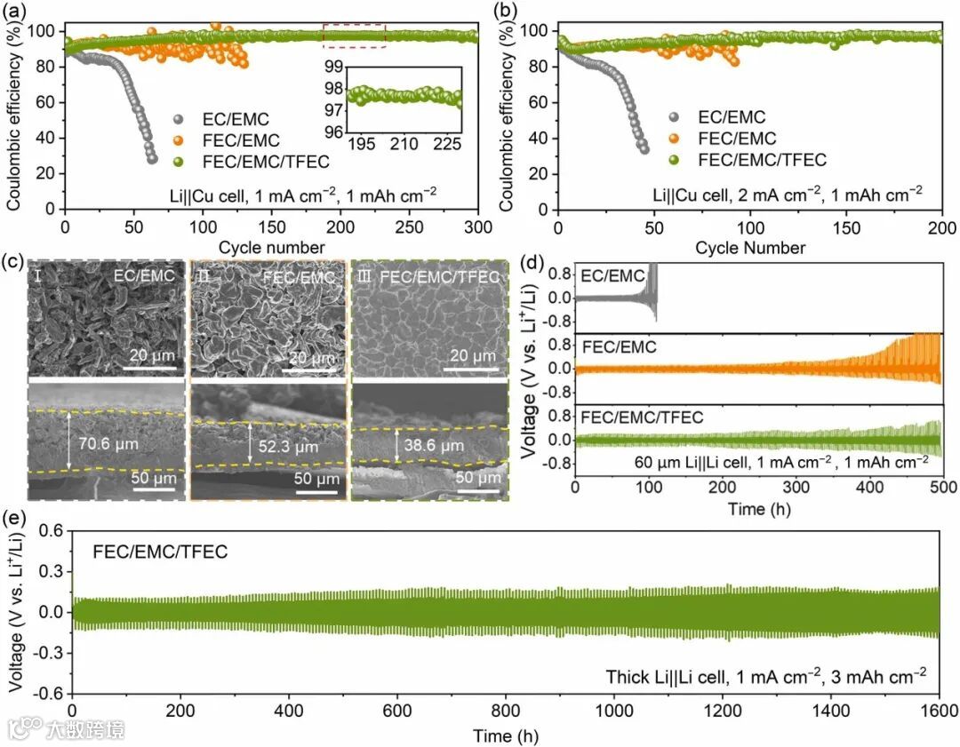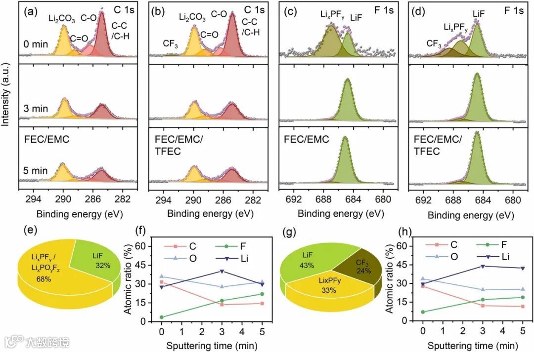 使用深度溅射X射线光电子能谱(XPS)分析了循环后Li电极表面的SEI成分。首先,形成的SEI由无机物(Li2CO3 ,LiF等)和来自电解质还原的有机物(ROCO2Li等)组成,外层含有更多的有机成分,在FEC/EMC/TFEC电解质得到的SEI表面发现了独特的-CF3 组的成分,同时含有较高比例的LiF。在FEC/EMC/TFEC电解液中得出的SEI在两个不同的深度表现出四种元素(C、O、F、Li)几乎恒定的原子比例,均匀的内部组成赋予了SEI独特的特性,使锂离子通量均匀,锂沉积平滑、紧密,从而最大限度地减少了副反应,提高了循环性能。