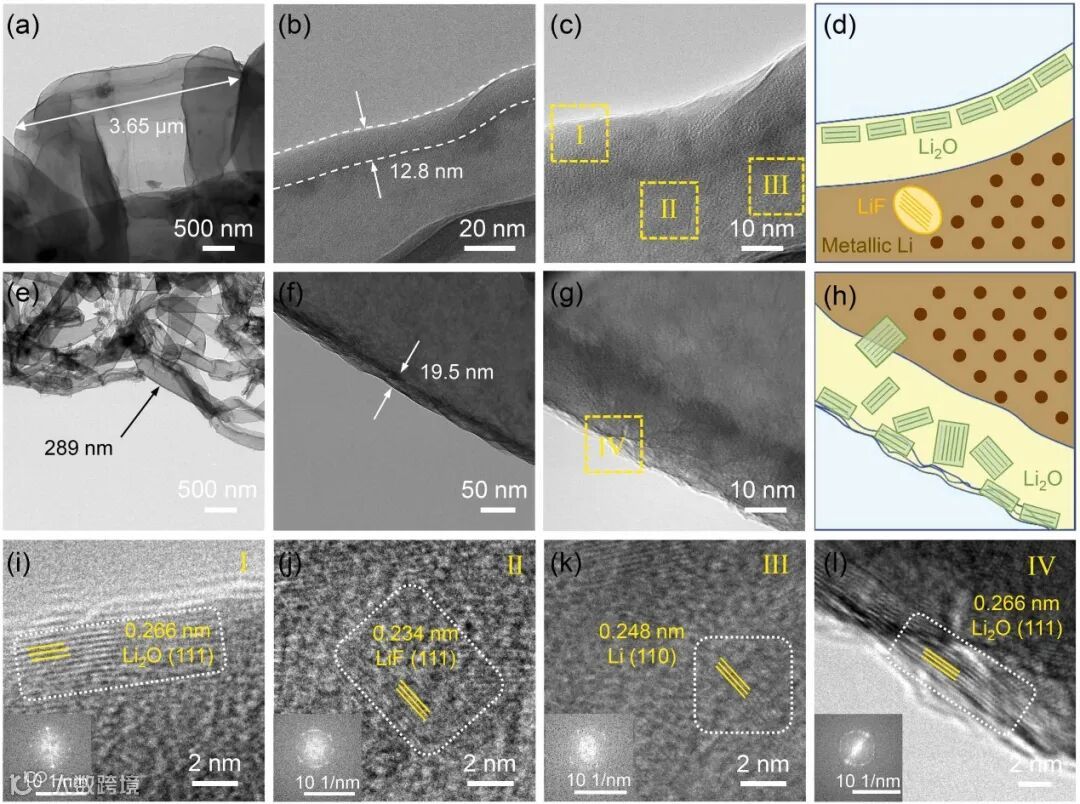 通过高分辨率低温电子显微镜(cryo-EM)实现了对LMAs上SEI纳米结构的直接观察,在FEC/EMC/TFEC电解液中获得的锂沉积物具有大的圆柱形或球形形状(几微米),具有一个厚度约为12.8纳米的光滑的SEI层。均匀致密的薄层Li2O晶体为整齐和规则的SEI提供了高的机械强度和增强的界面稳定性。